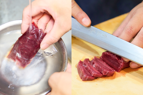 パックのまま解凍→スライス→盛り付けの簡単3ステップで提供可能!技術と経験が必要なトリミングやグラム数の調整は不要なので、スタッフへの教育も簡単に導入できます!